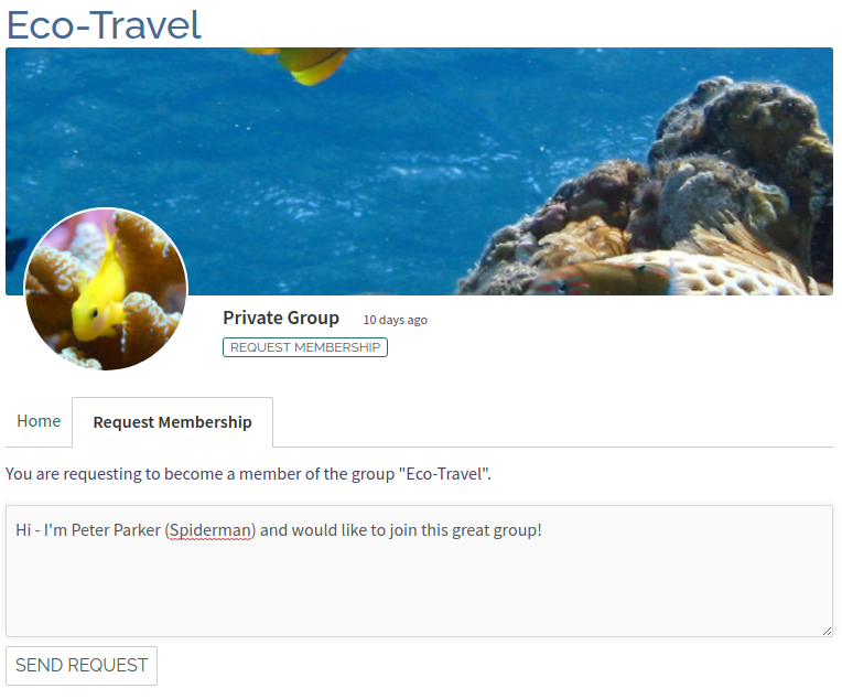 At this point our user Spiderman can either go away and look for other groups, or request to join. Selecting the Request Membership link brings up the following: