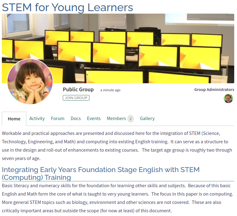The STEM for Young Learners focus is on workable and practical approaches for the integration of STEM (Science, Technology, Engineering, and Math) and computing into existing English training. It is meant to serve as a structure to use in the design and roll-out of enhancements to existing courses. The target age group is roughly two through seven years of age.