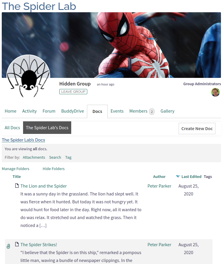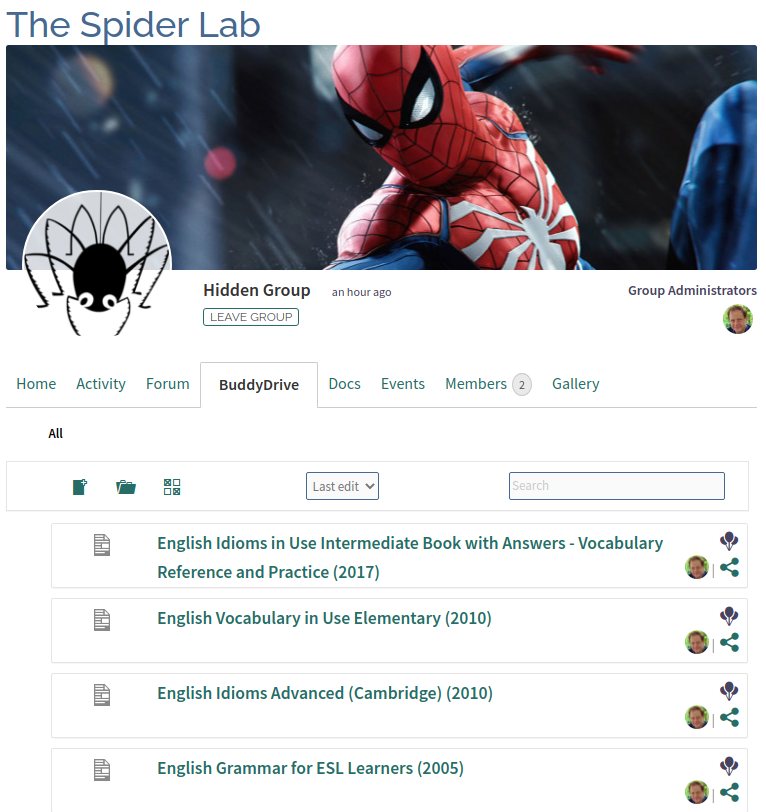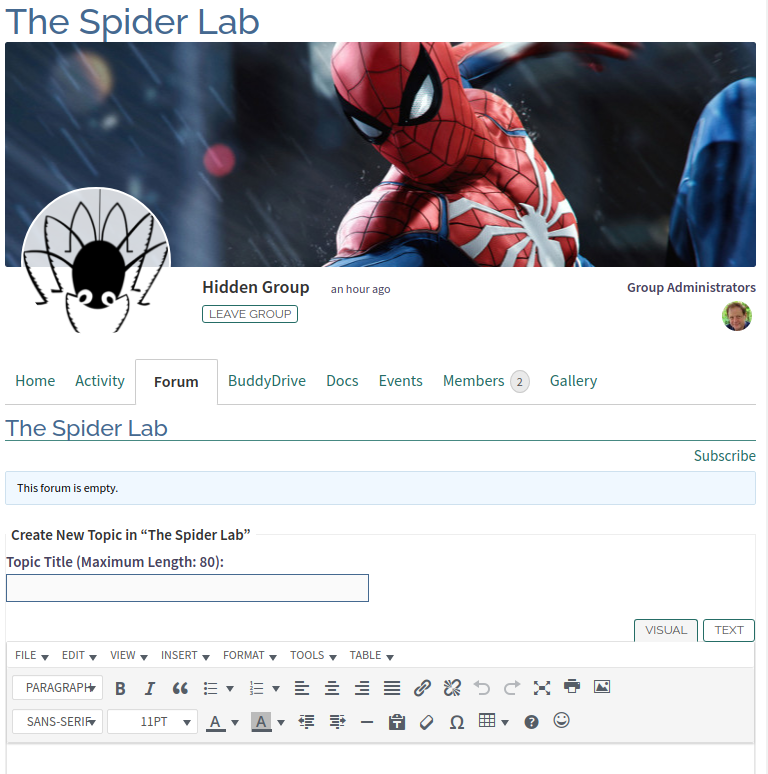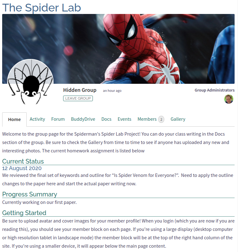 The Spider Lab is setup as a hidden group and is used as a one on one tutoring environment (just Spiderman and the tutor). It could also be used as a collaborative classroom with additional students just as easily by inviting more students to join. The group has it’s own private (hidden) forum, cloud storage, gallery, and collaborative document authoring areas. Membership in this group is by invitation only (group admin and moderators only) and it cannot be searched or indexed in the site group list.