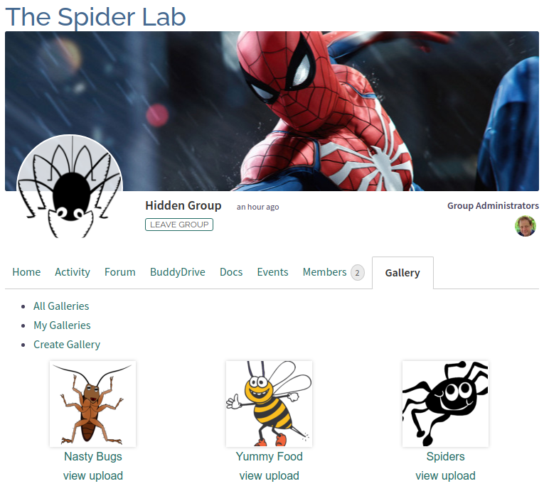 All the standard services have been enabled for this group (Forums, Documents, Cloud Storage and Galleries). Their use is identical to the hidden Spider Lab example above.
