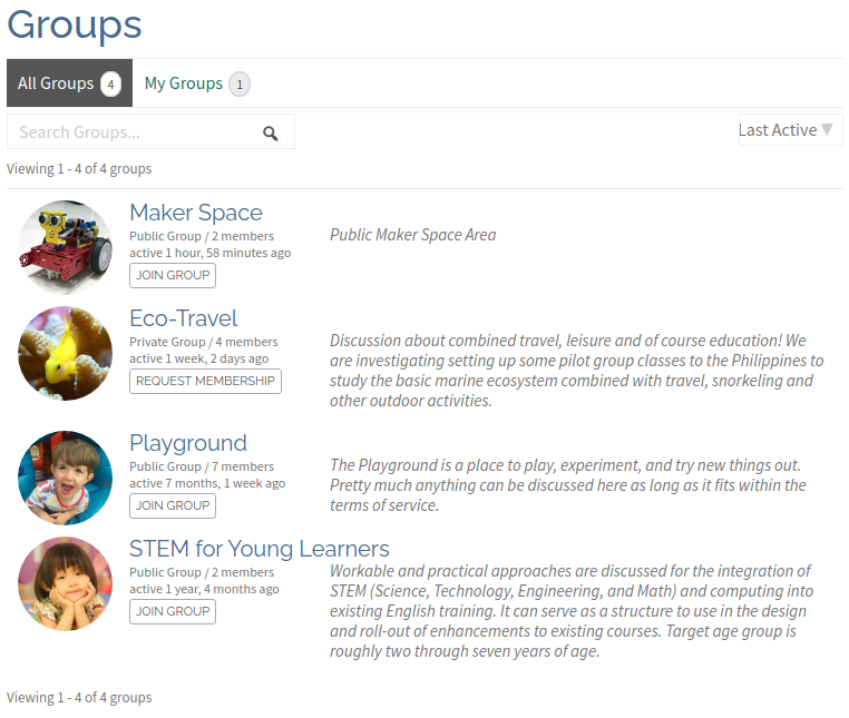 This group is setup as a public group as the information being shared or dealt with here might be of interest to some members of the educational community not familiar with Teachers Network. This allows the search engines to index the group and results to be presented in their search results. Invitations to join can be sent by any group member. Membership can also be directly requested through the system group listing. Unlike the private group example above (Eco-Travel), as this is a public group, membership requests do not need moderator approval and are immediately granted and applied.