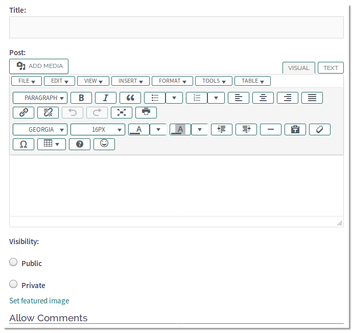 This is the standard site editor. For more information on how to use the editor see the How-To guide Using The Site Editor. You can create your new page here. The look and feel is similar to many popular word processing systems so should be mostly intuitive. For a more in-depth description of what you can do with this powerful editor, see the How-To guide referenced above. For our purposes here you will need to first set a unique title for your page. This page title is displayed in your blog listings, however not when the page is used as your home page. Enter a title (cannot be empty) that makes sense to you. After creating some content you will need to set the visibility. If you want others to see your page you will need to set the visibility to Public. Finally at the bottom of the form it asks if you want to allow comments or not. If you want other uses to be able to comment and leave you messages about your page click on the Yes checkbox.